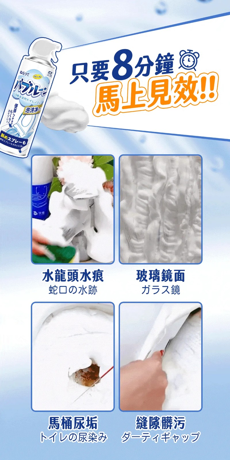 半小時前雪泡淨浴廁清潔慕斯 ,馬桶不刷也能亮 , 浴室清潔一瓶搞定 - 【買五送三】【MokoClean雪泡淨】8入組,團購好友分享 免運 NT$1299