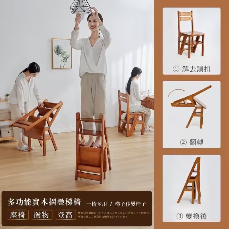20分鐘前【現貨】二合一折疊梯子椅,木料製作,打磨精緻,可變為簡易小梯子,可幫助拿取高處物品 - 【三層|純實木|翻转收纳】NT$2580